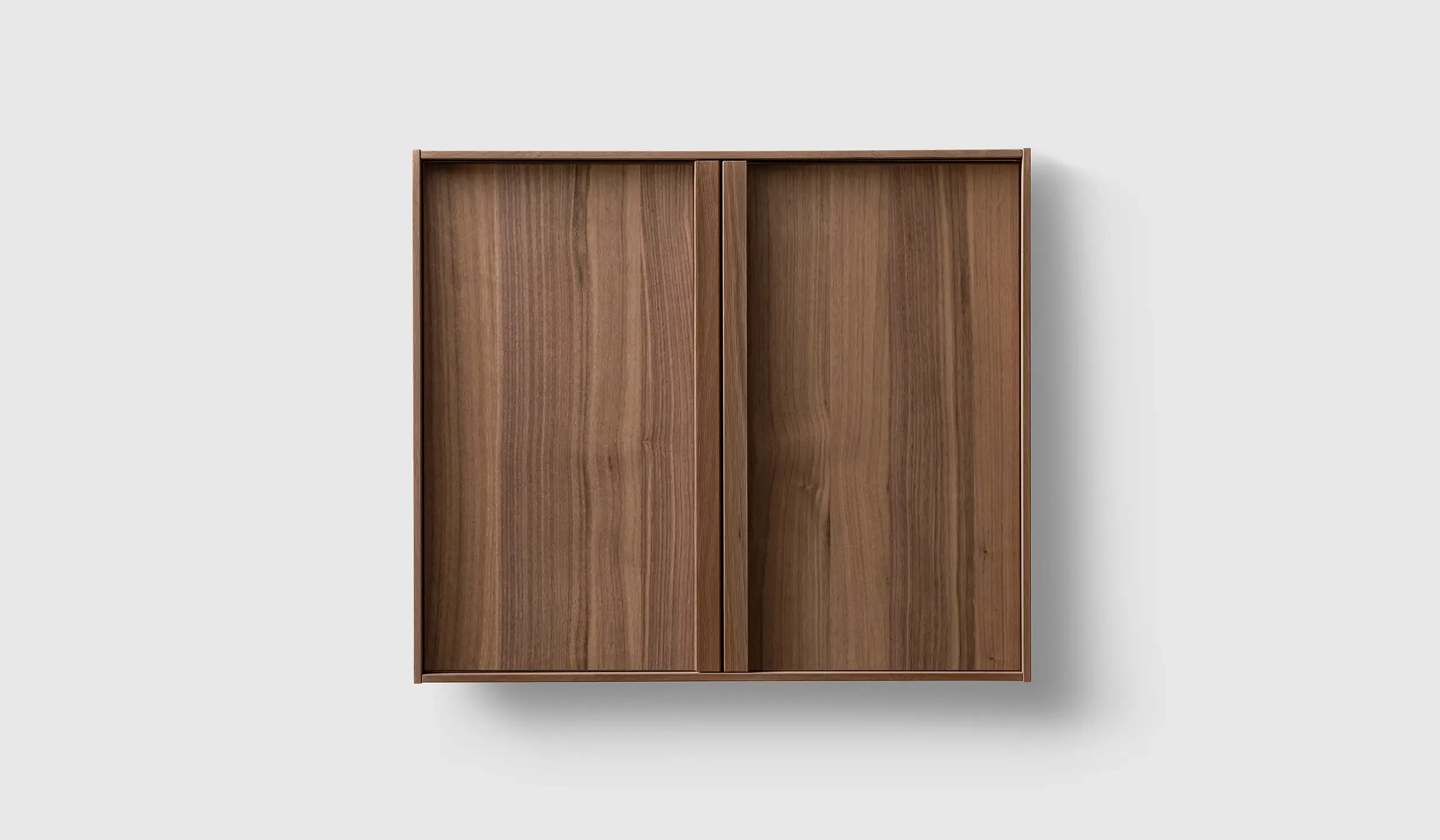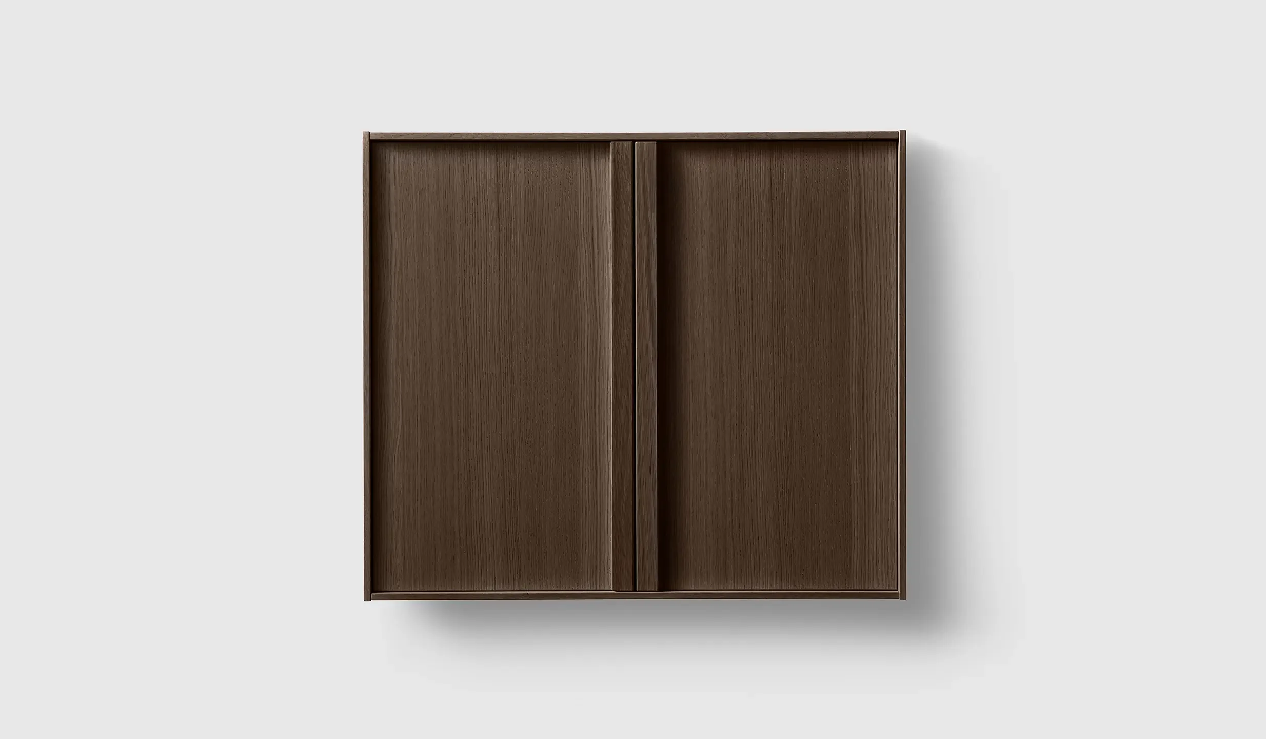Veggskap i ekte trefiner med håndtak og perforerte hyller. Glatt montering med full opphengsskinne. Dybde 320 mm.