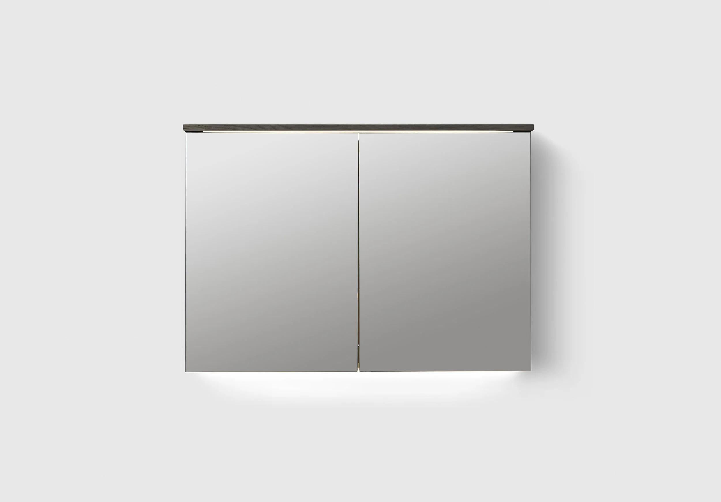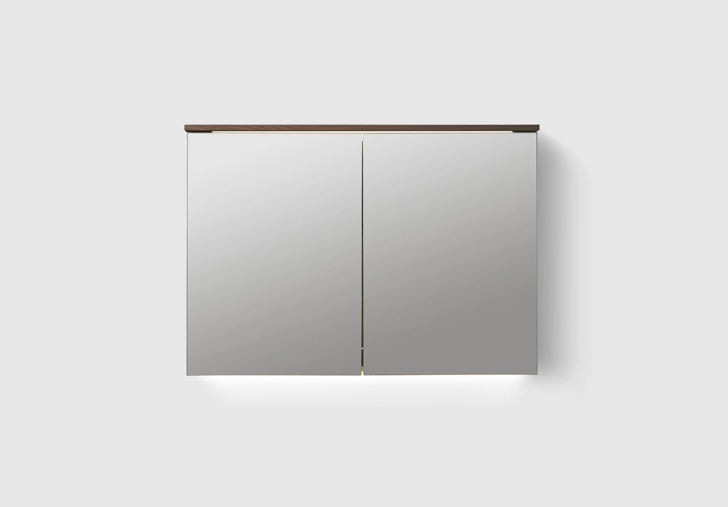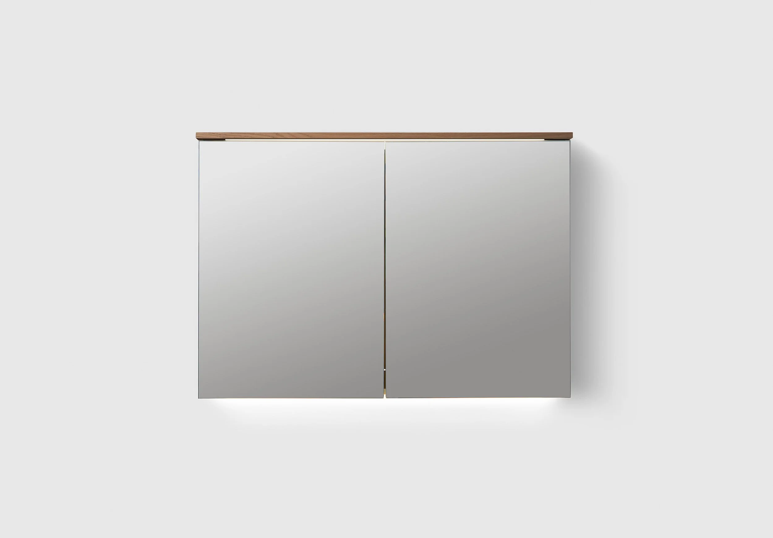 Speilskap i ekte trefinér med doble speil og to perforerte metallhyller samt over- og underbelysning i LED. Innredning TRAY A3.24 og BOX SMALL A3.22 er inkludert i alle speilskap. Stikkontakt montert i overkanten av skapet. Enkel installasjon med hel opphengs skinne. Dybde 140 mm.