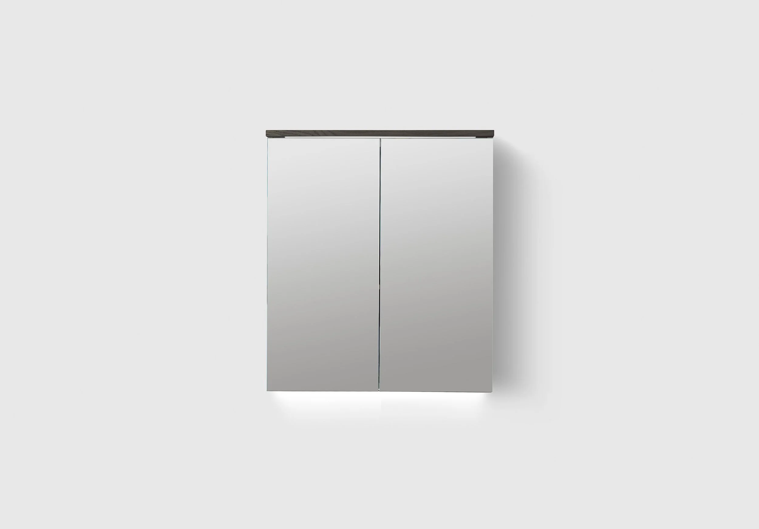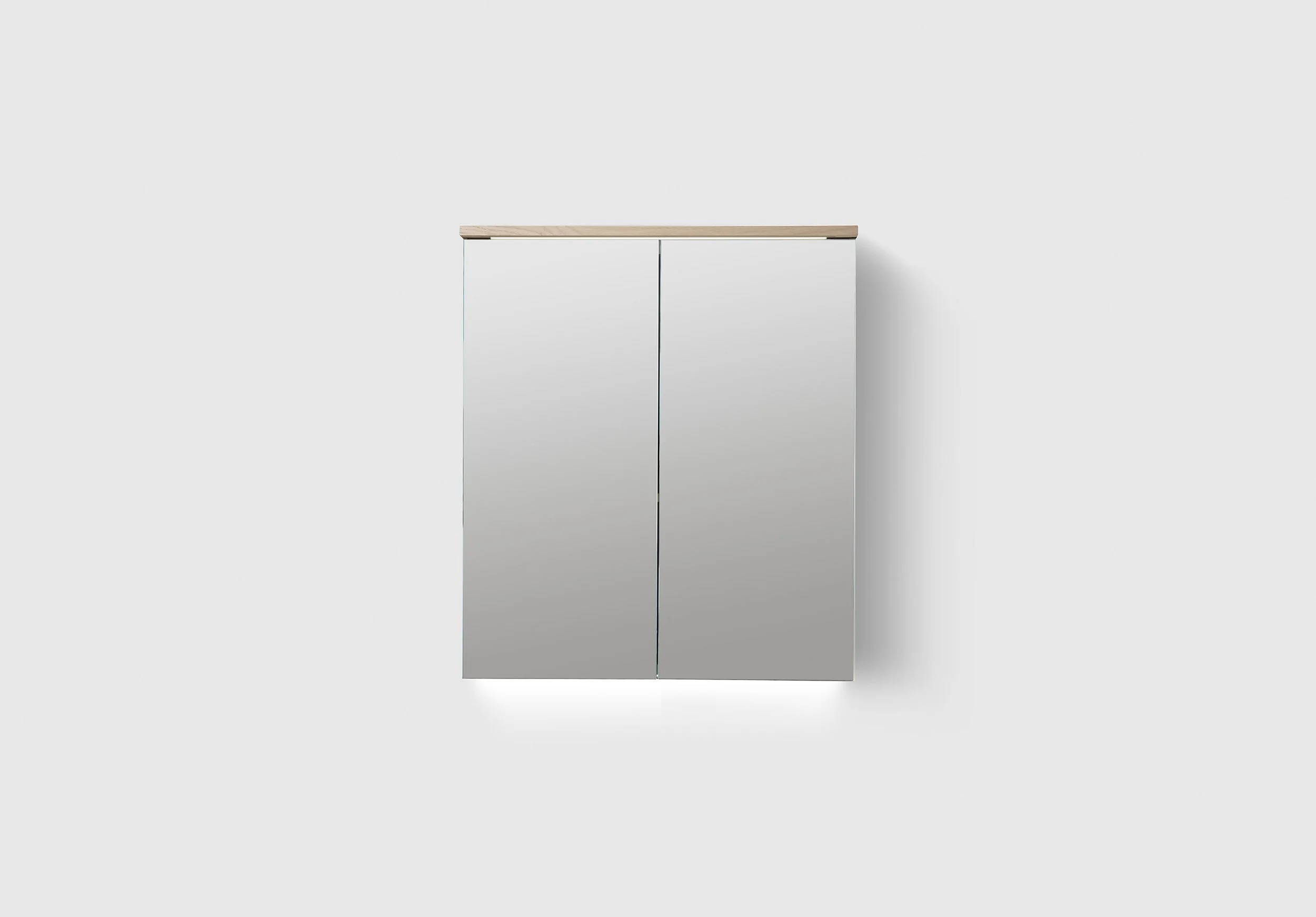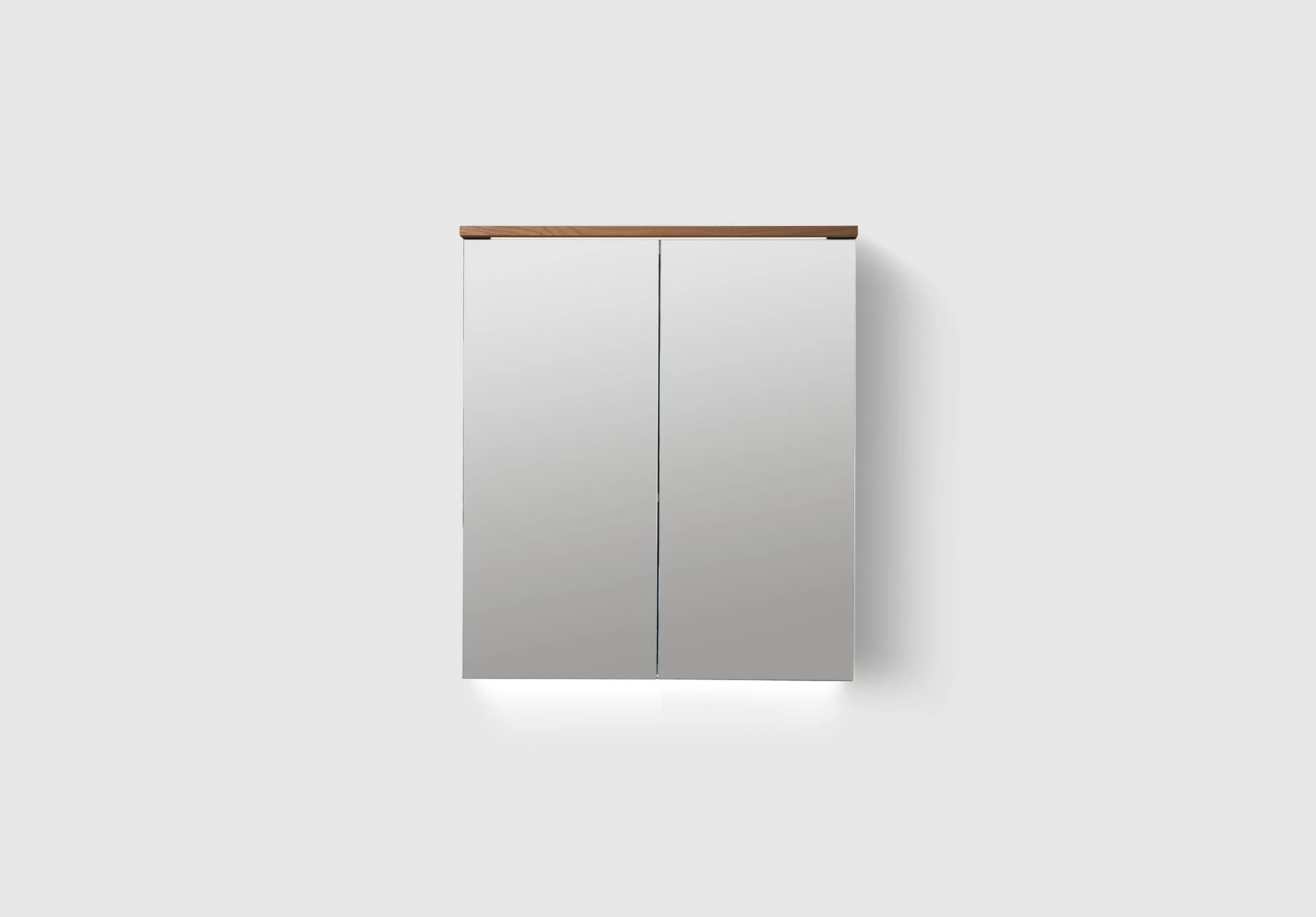 Speilskap i ekte trefinér med doble speil og to perforerte metallhyller samt over- og underbelysning i LED. Innredning TRAY A3.24 og BOX SMALL A3.22 er inkludert i alle speilskap. Stikkontakt montert i overkanten av skapet. Enkel installasjon med hel opphengs skinne. Dybde 140 mm.