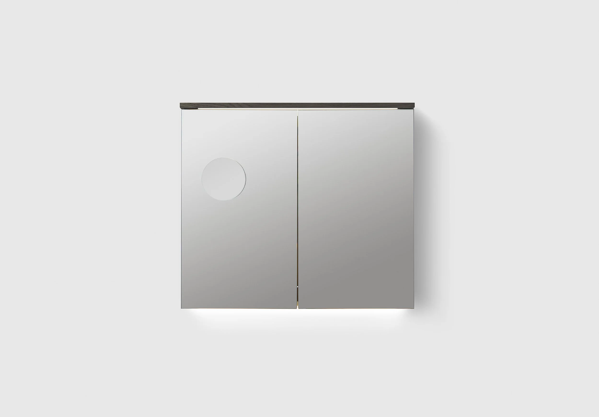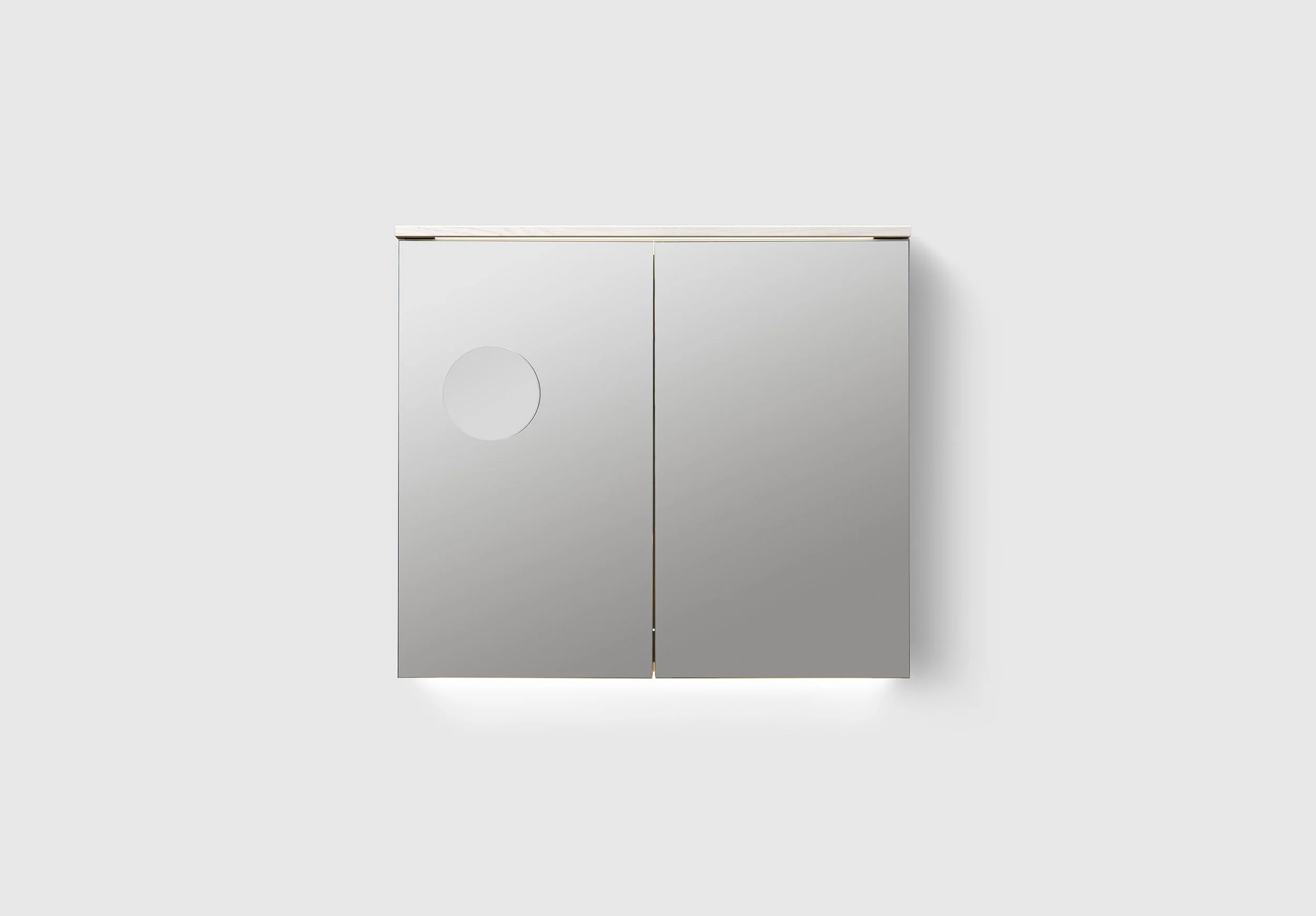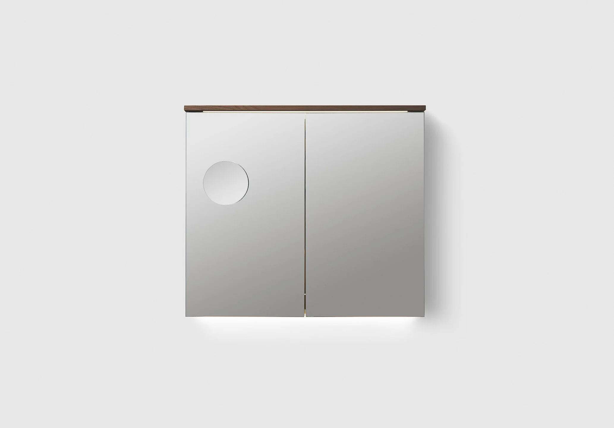 Speilskap med sminkespeil i ekte trefinér med doble speil og to perforerte metallhyller samt over- og underbelysning i LED. Innredning TRAY A3.24 og BOX SMALL A3.22 er inkludert i alle speilskap. Stikkontakt montert i overkanten av skapet. Enkel installasjon med hel opphengs skinne. Dybde 140 mm.