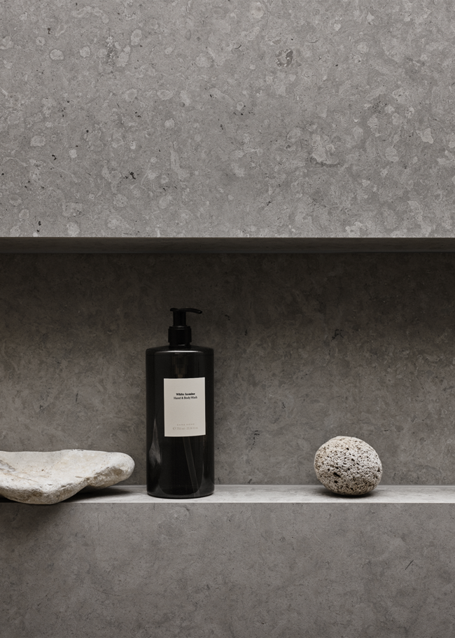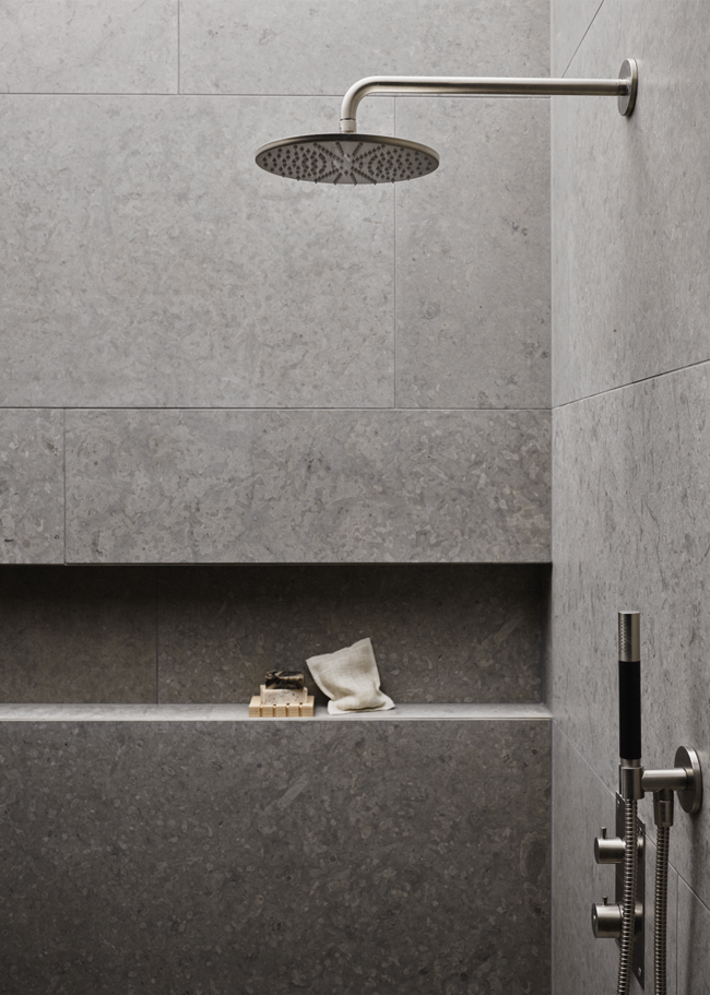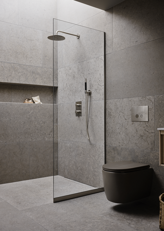 Runö Light Grey er en grå granittkeramikk med kalksteinsutseende i en matt overflate. Runö er svært naturlig med fossilaktige detaljer og vakre varierende toneforskjeller mellom platene.