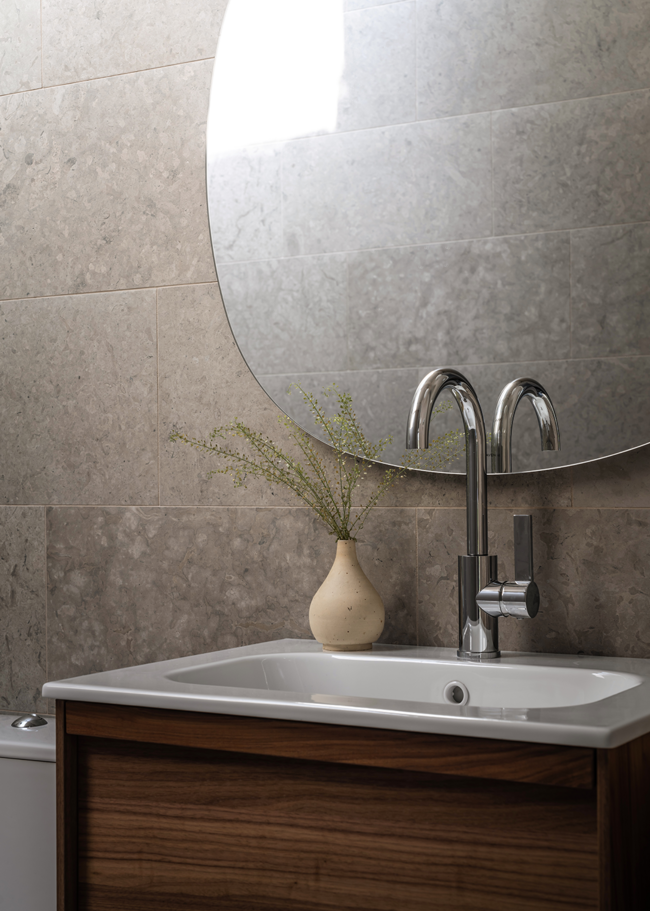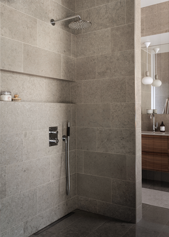 Runö Warm Grey er en varm grå granittkeramikk med kalksteinsutseende i en matt overflate. Runö er svært naturlig med fossilaktige detaljer og vakre varierende toneforskjeller mellom platene.