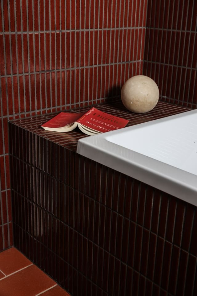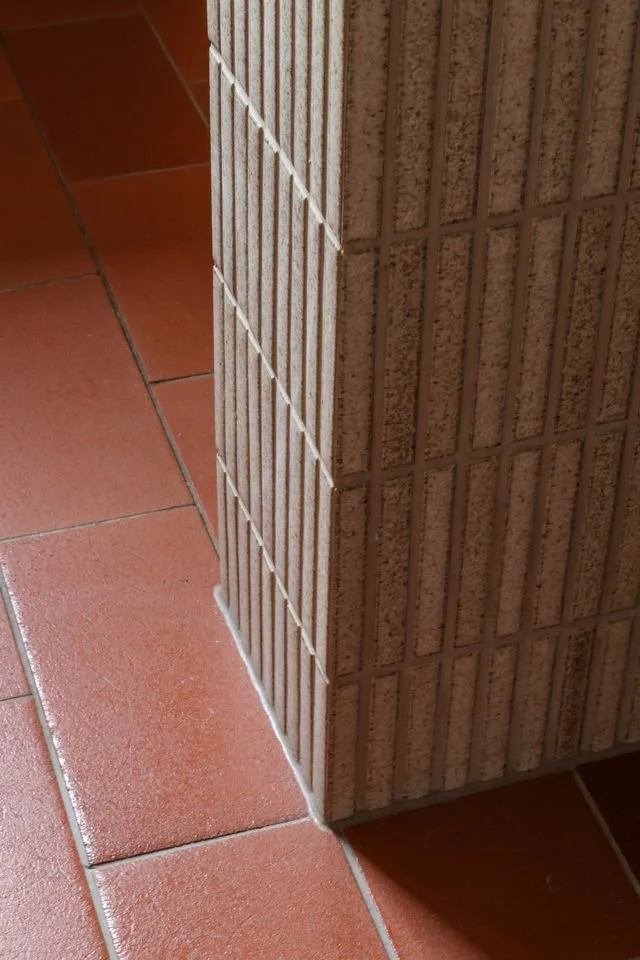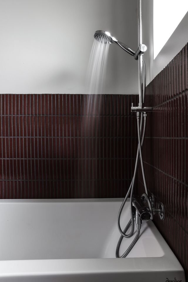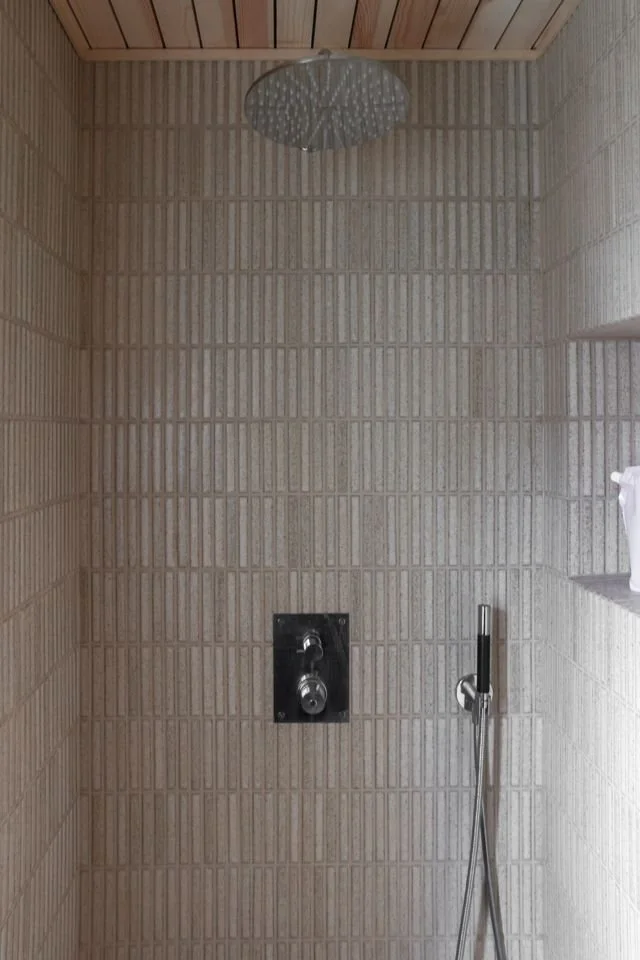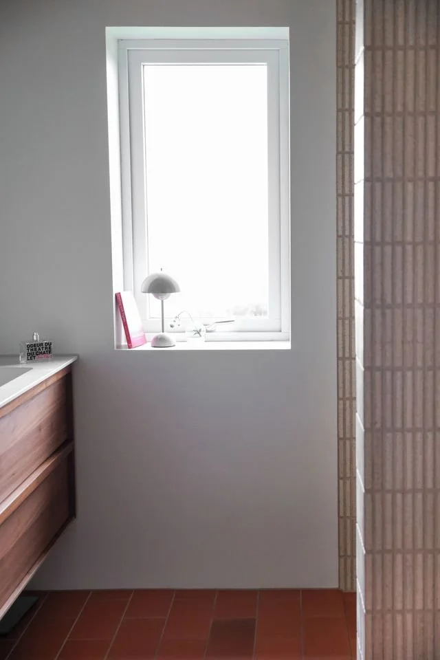 På det andre badet er samme terracottaflis brukt på gulvet sammen med Koyohen Oat på veggene, som gir et lysere og mykere spill i overflatene.