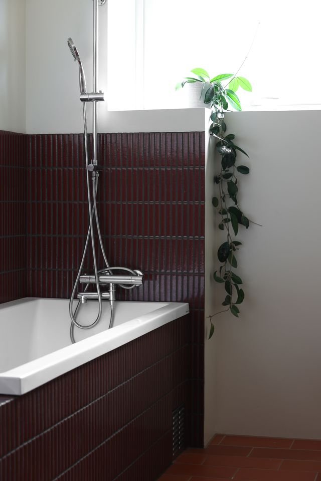 De to badene har fått hver sin tolkning, men med en tydelig rød tråd. På det ene er Cotto Plus kombinert med Koyohen Brick, der de japanske flisene gir en fin kontrast med sitt presise og taktile uttrykk.