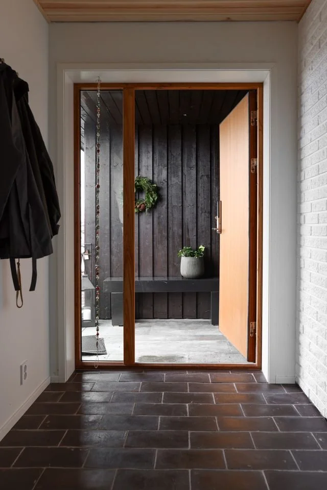 I gangen møter man håndlagde terracottafliser i Terre Colorate Dark Grey. De gir et dempet, nesten steinaktig uttrykk, samtidig som variasjonen i hver flis tilfører liv. Resultatet er en inngangssone som føles solid og inviterende – og som tåler bruk.